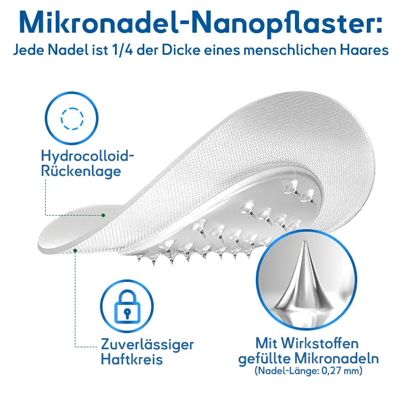 Jede Nadel ist nur 0,27 mm lang โ gerade einmal ein Siebtel der Dicke eines Haares โ und besteht aus einem auflรถsbaren Wirkstoff. Diese Mikronadeln werden mit modernster Fertigungstechnologie prรคzise hergestellt, um eine nahtlose, schmerzfreie Anwendung zu gewรคhrleisten und die Wirkstoffe effektiv direkt in die Haut zu transportieren.